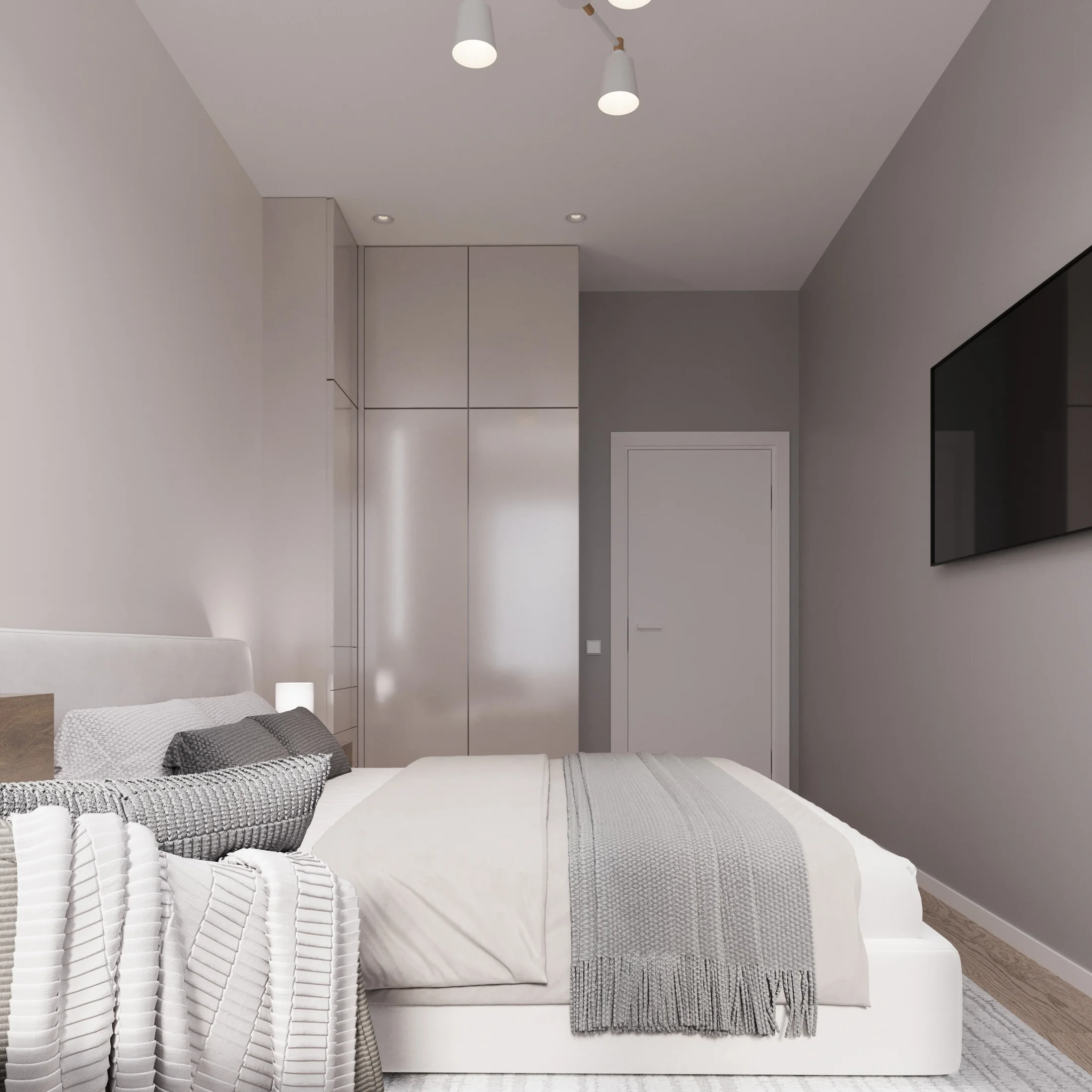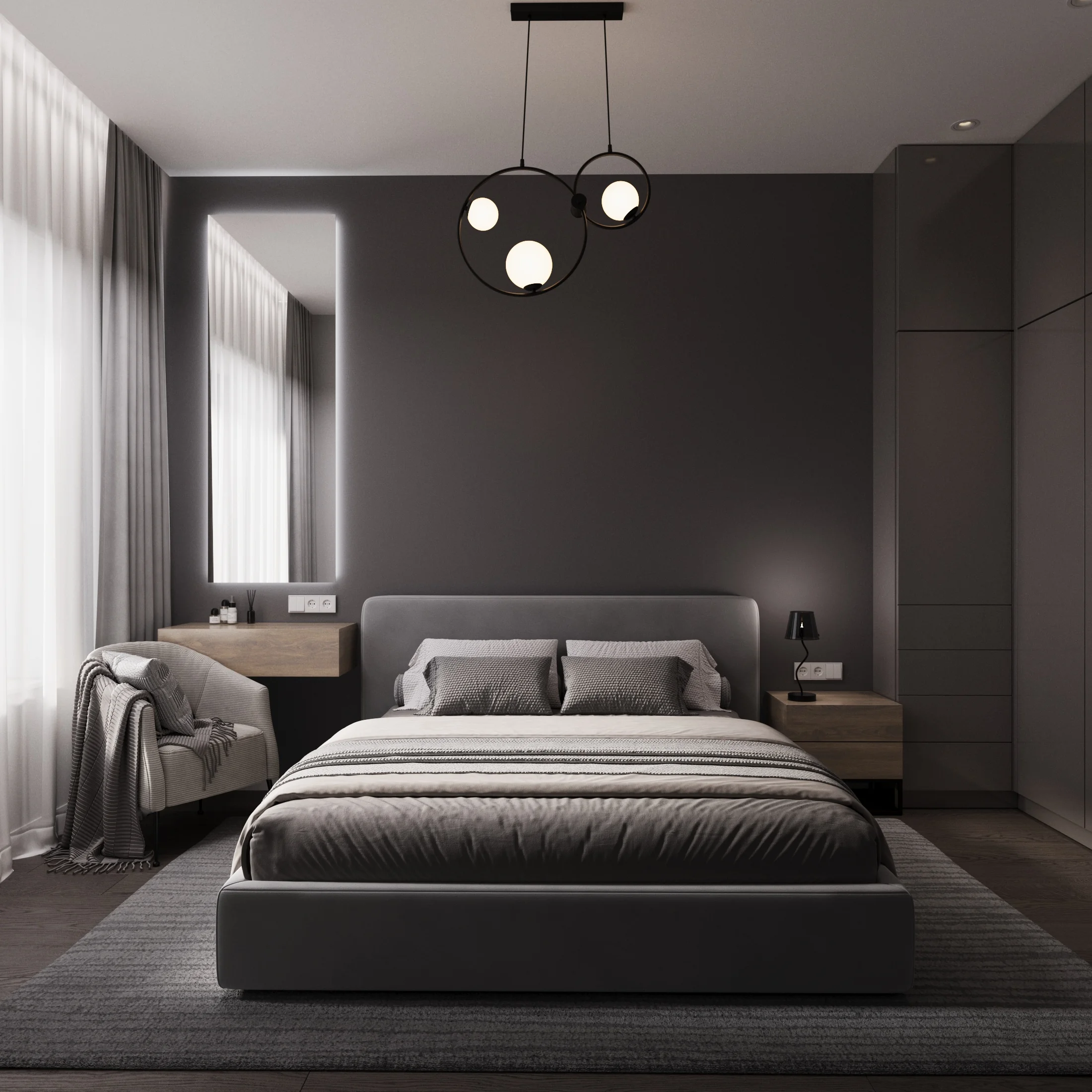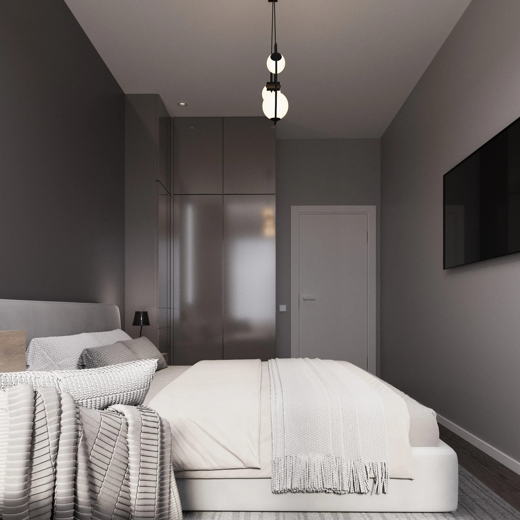 Сочетание насыщенных серых стен с белыми дверями и черной фурнитурой