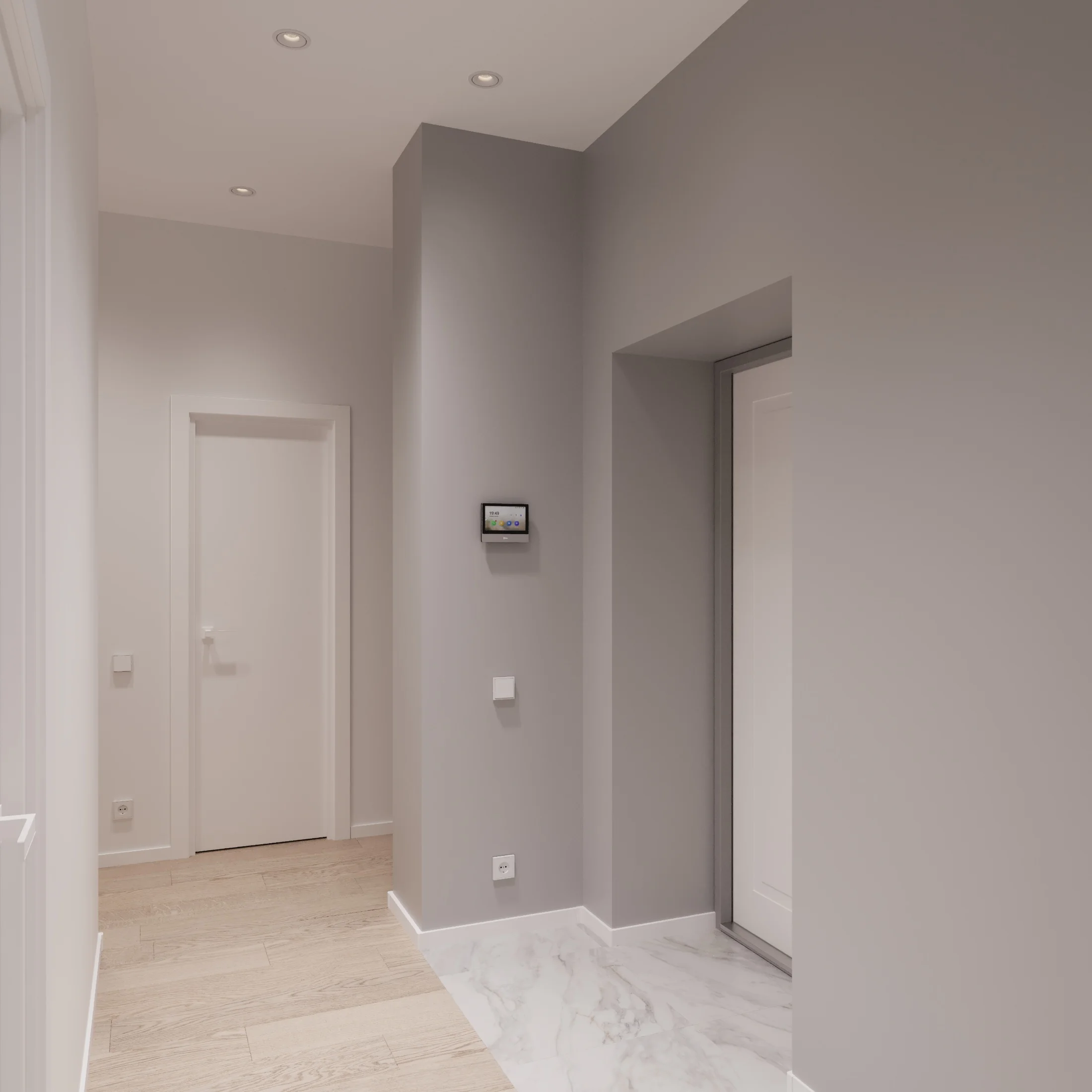 Светлая матовая плитка Calacatta Bianco в прихожей и санузле