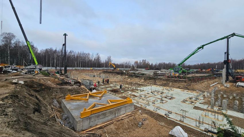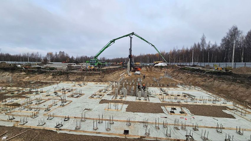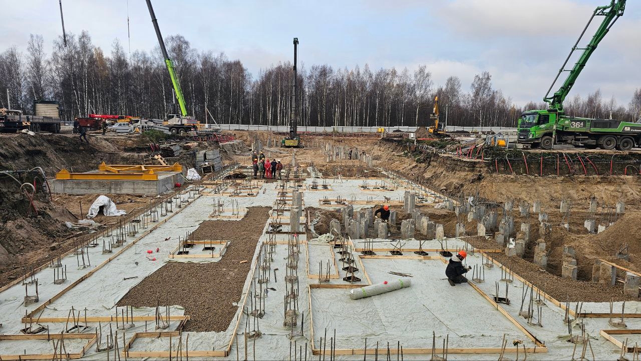 Работы идут по плану без задержек. К концу ноября планируется выполнить 70% работ по ростверкам на первом этапе.