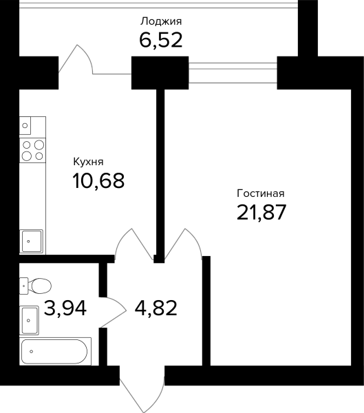 1-комнатная, 44.57м²